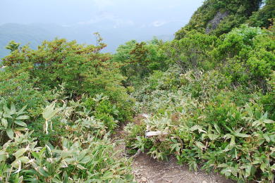 | 女人堂の脇に薬師岳に進む登山道があります。 そして、薬師岳の向こう側には八ッ峰があります。 |